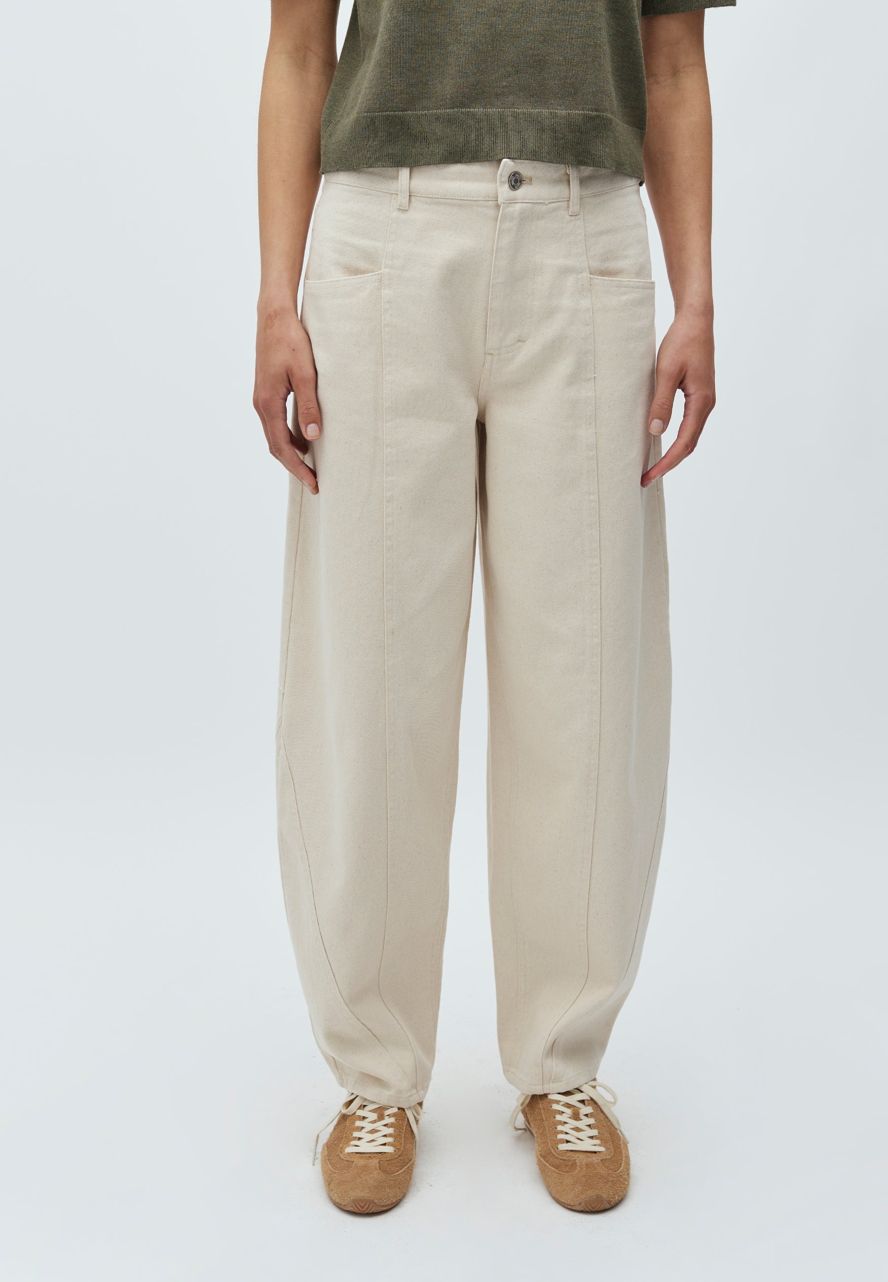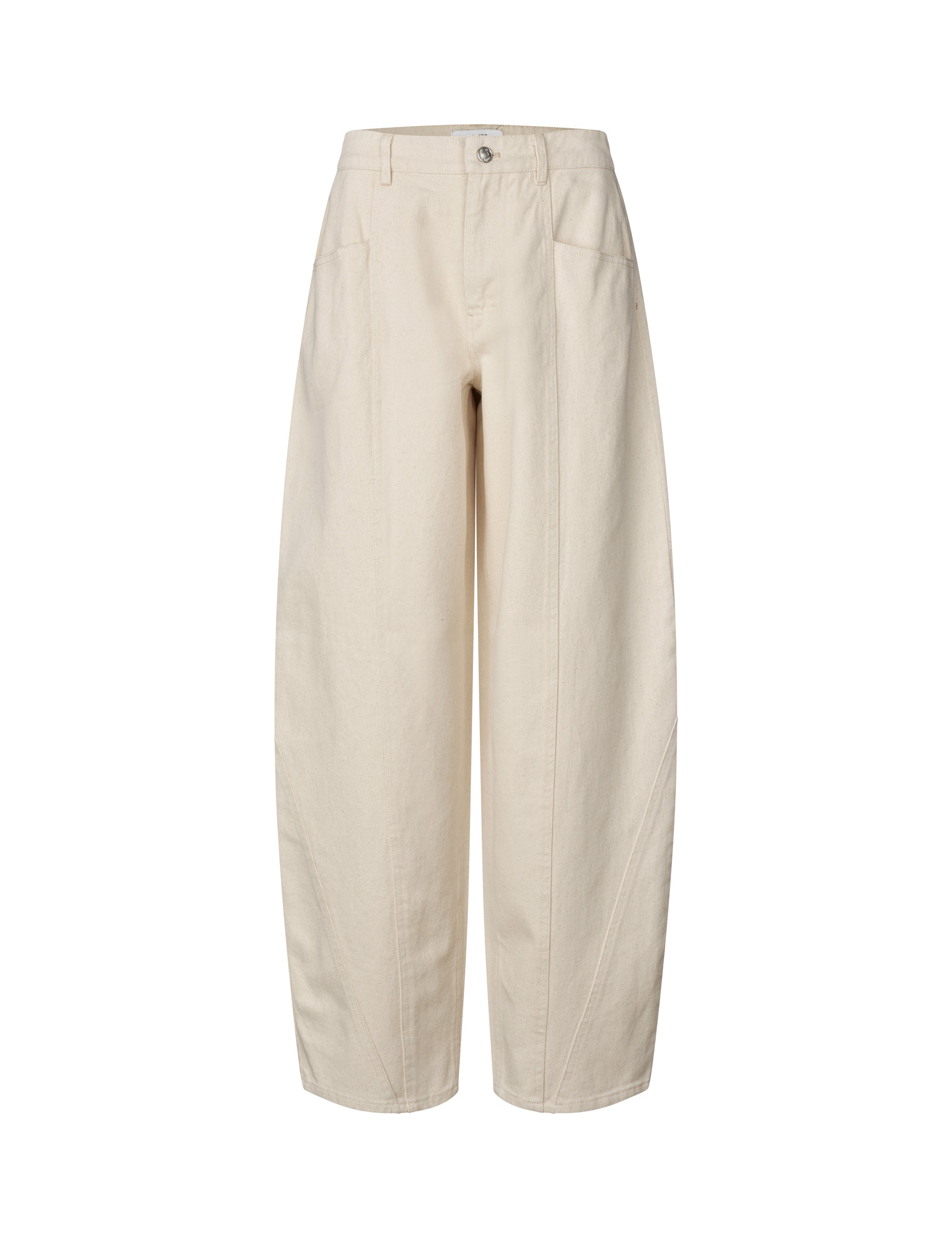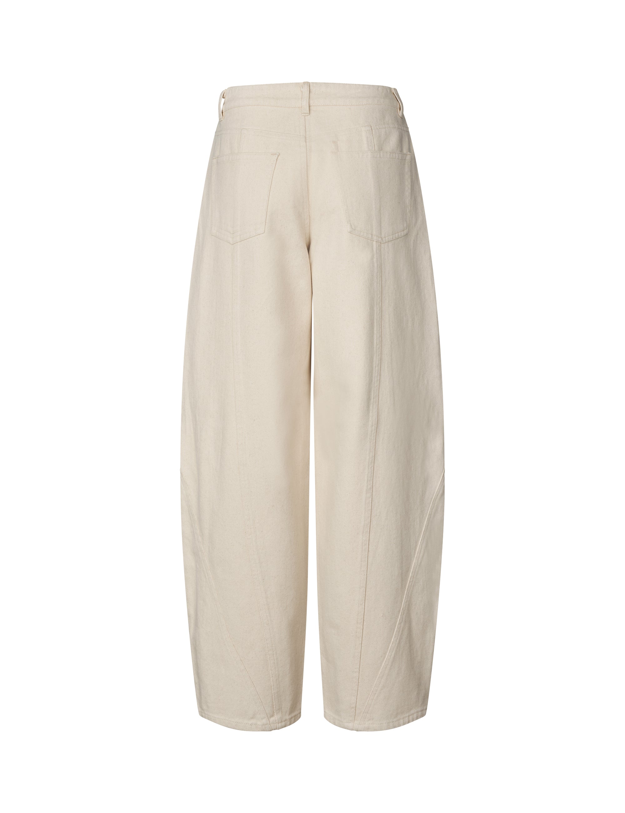 - Curved, voluminous legs with a loose fit around hips and thighs
