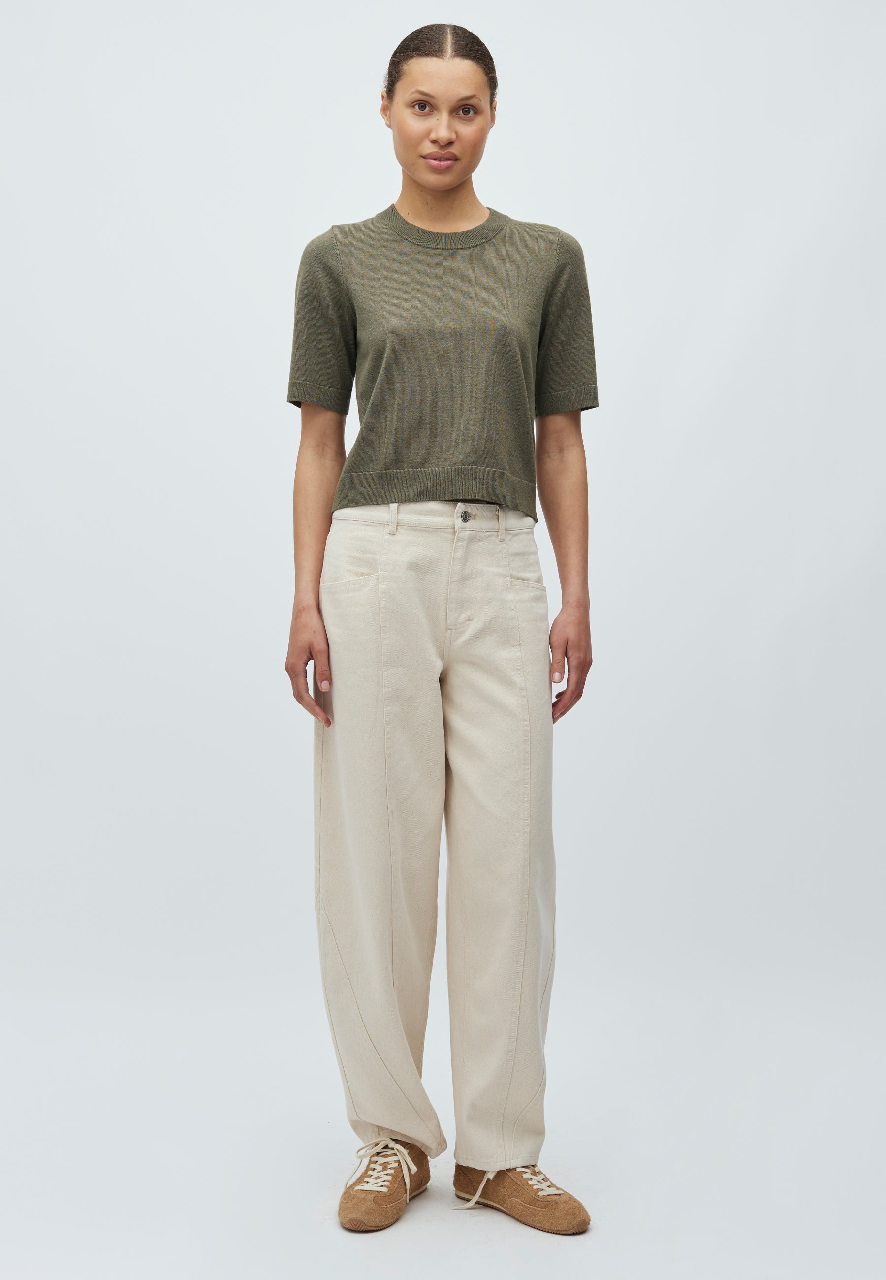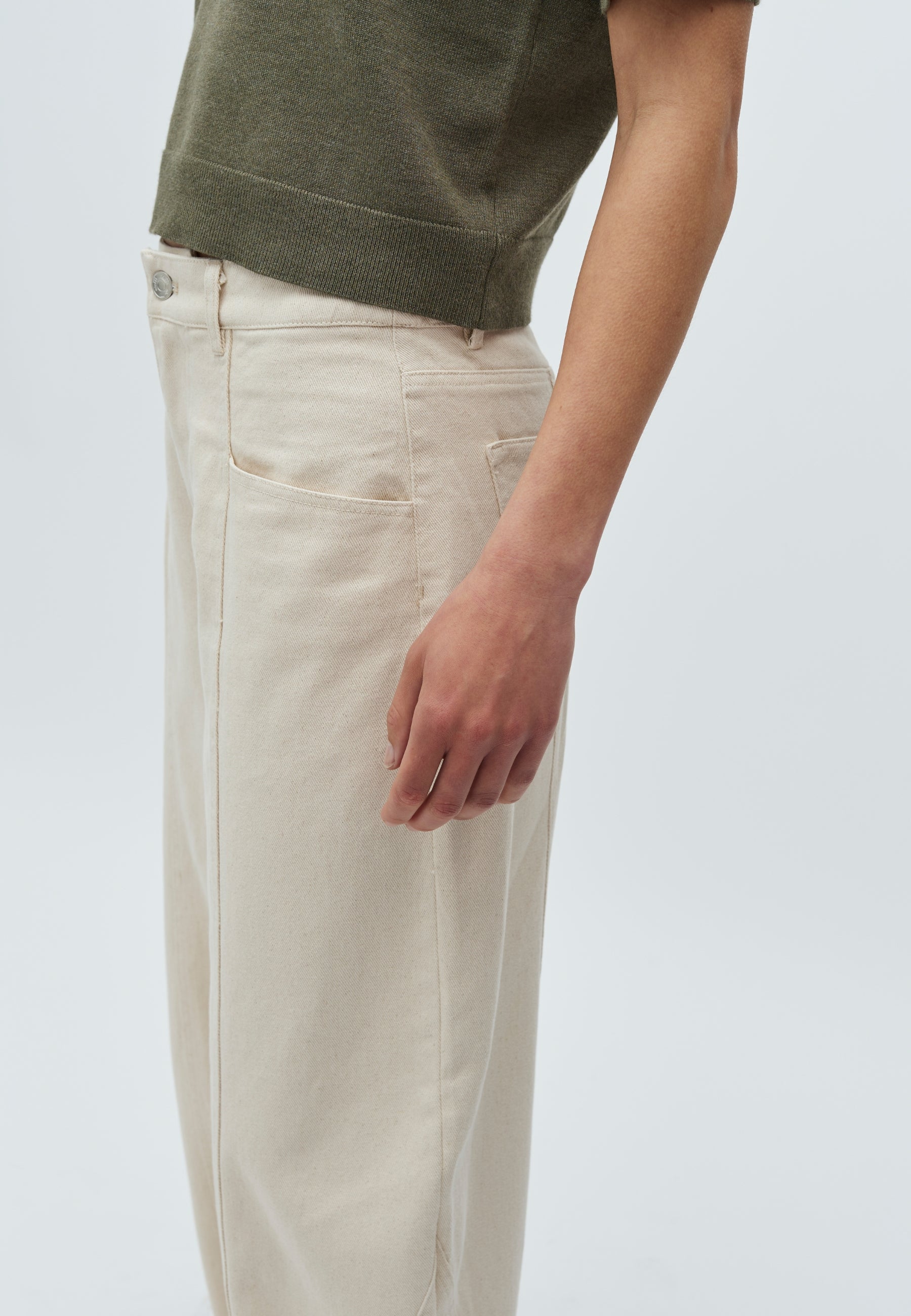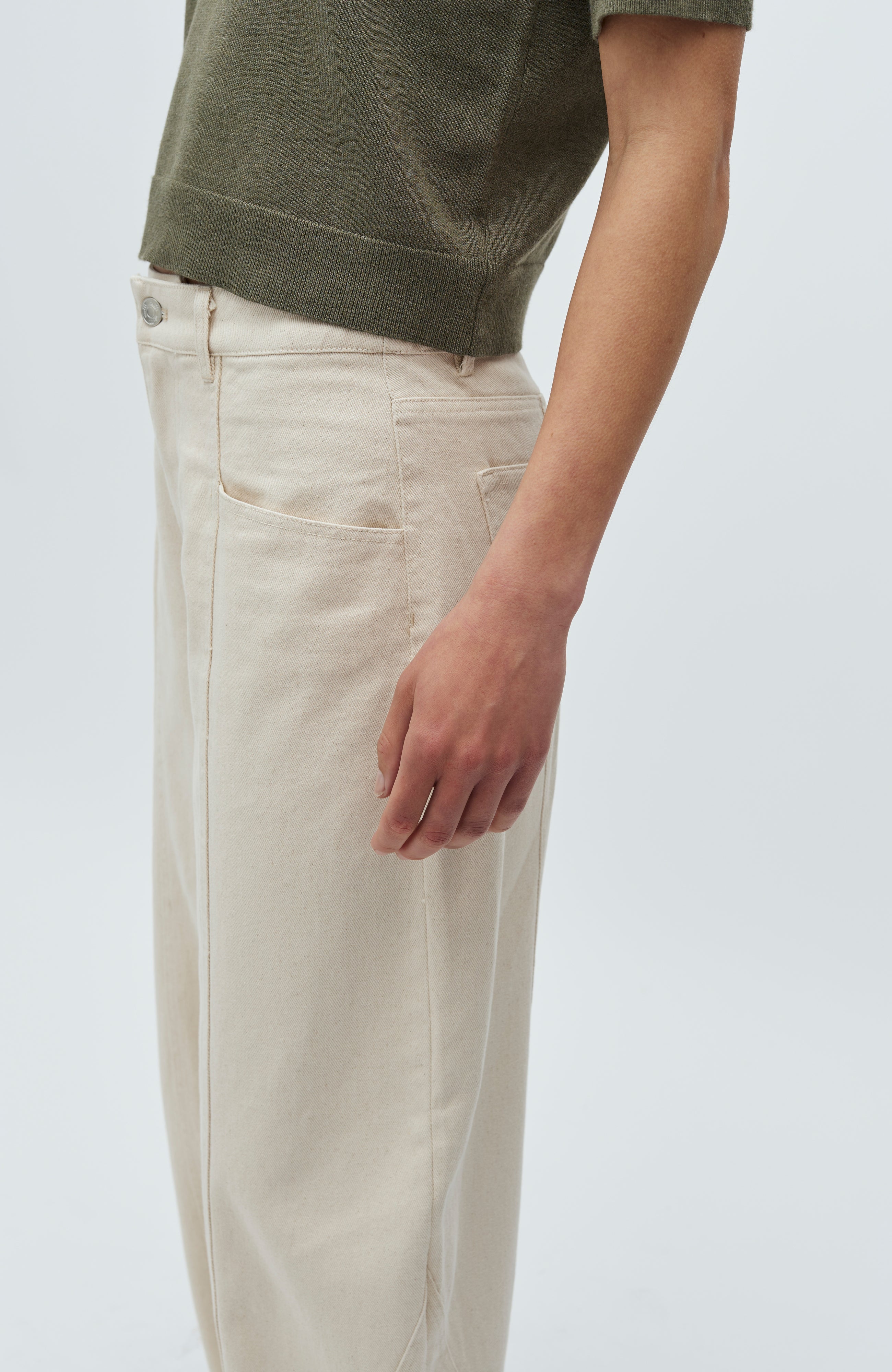 - Curved, voluminous legs with a loose fit around hips and thighs