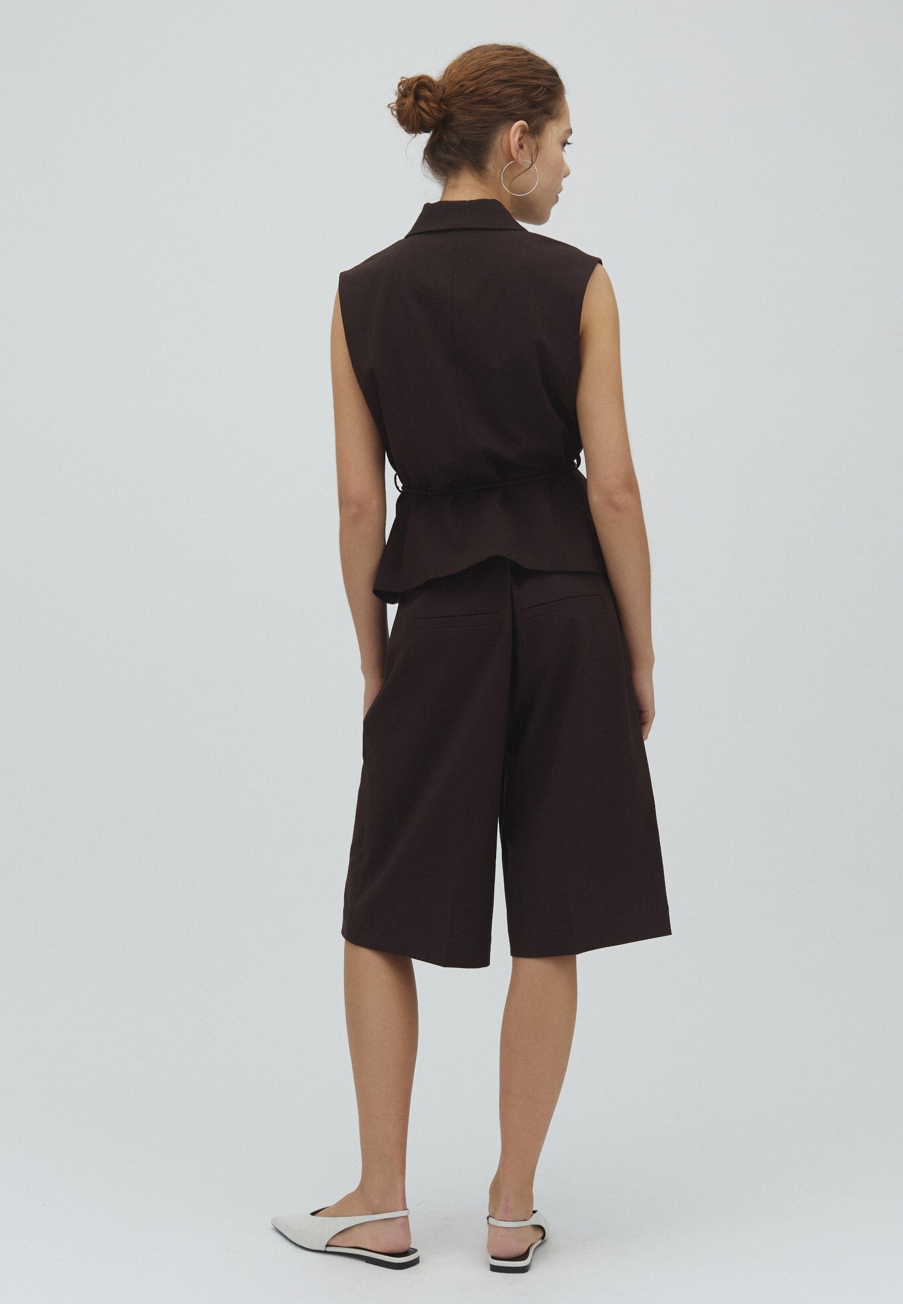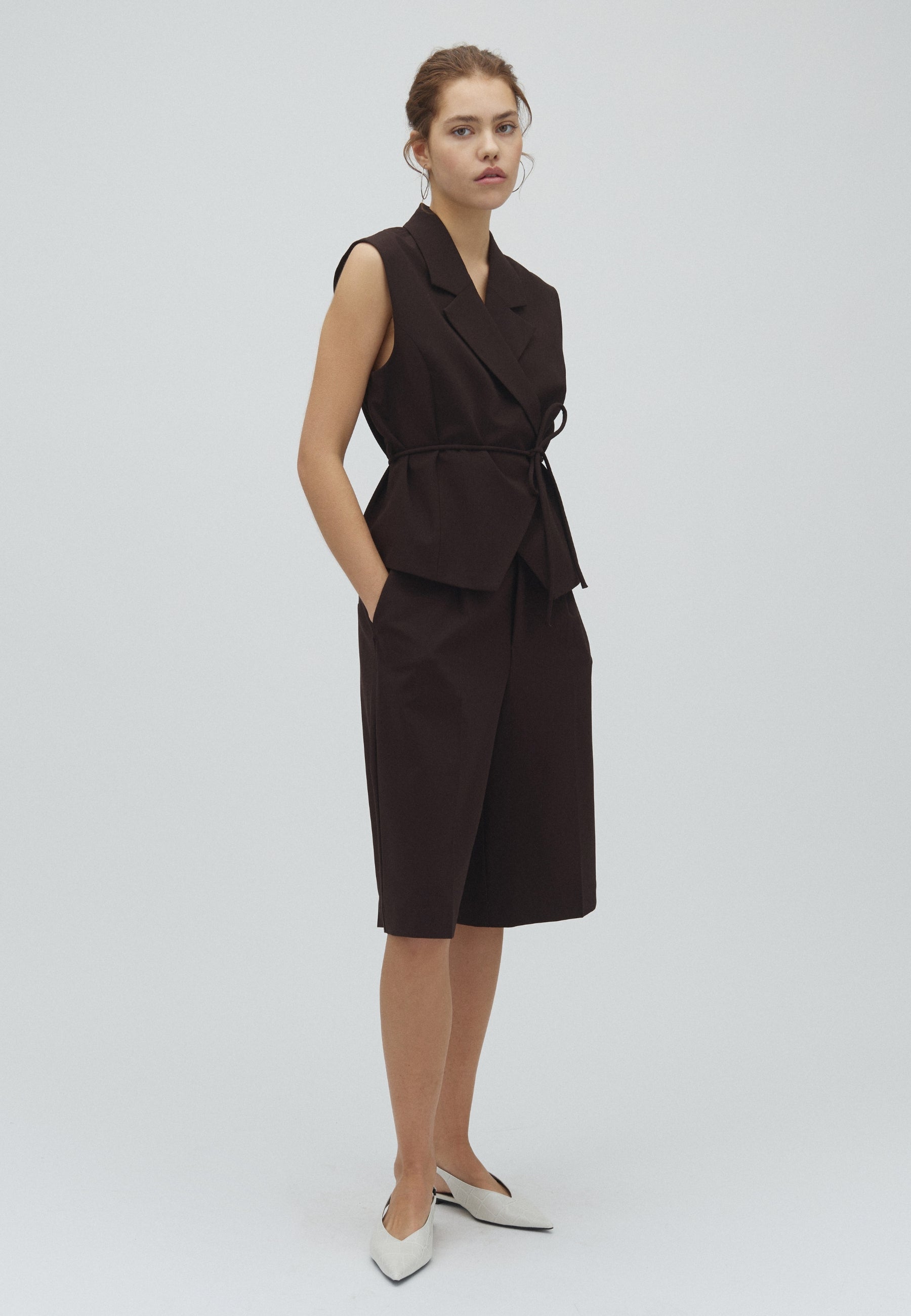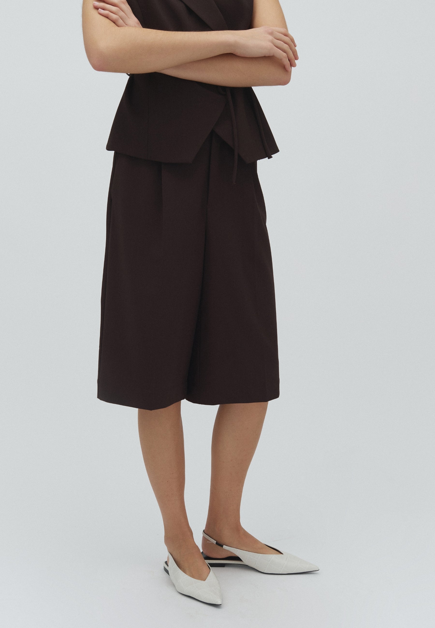 Knee-length suit shorts with pleats.