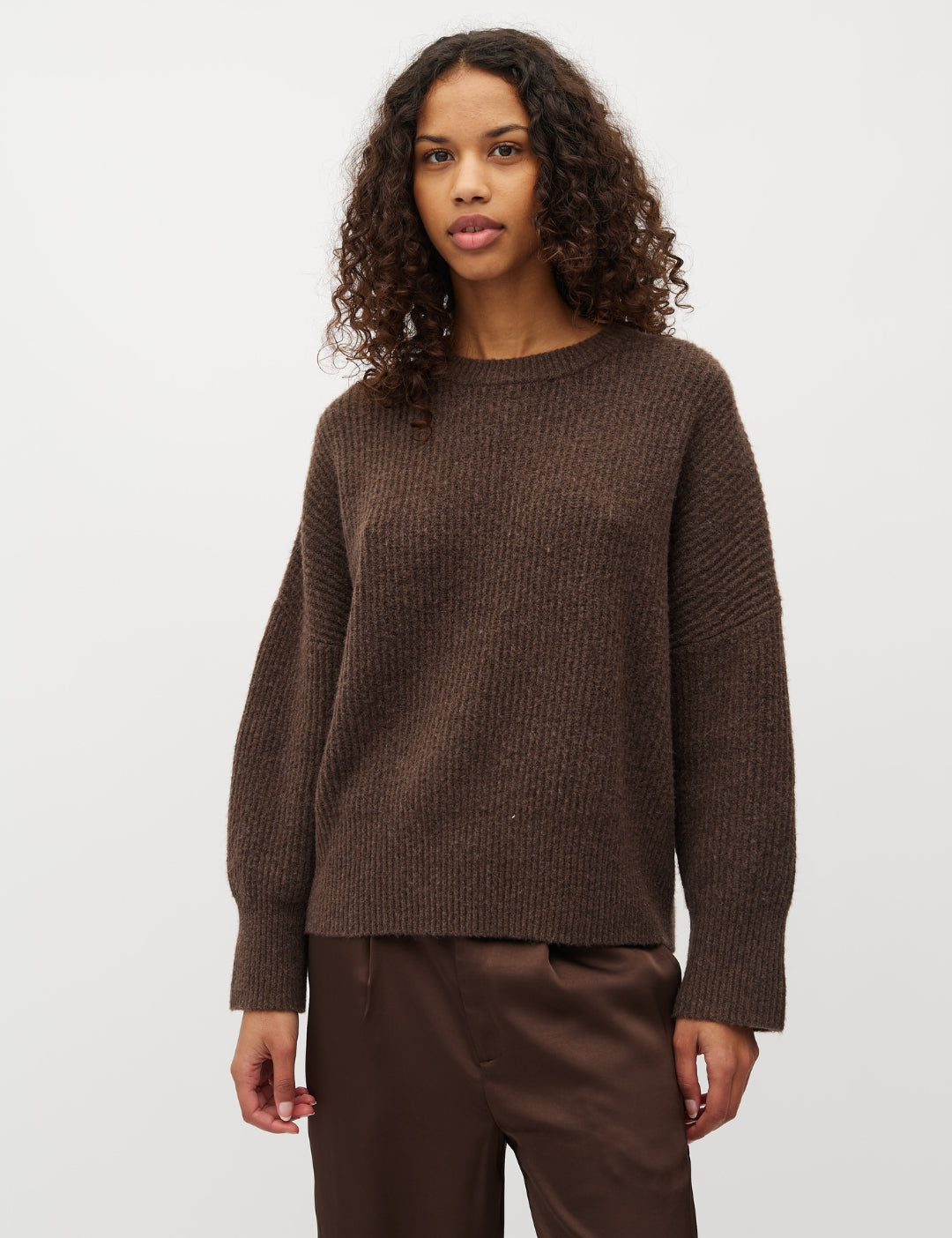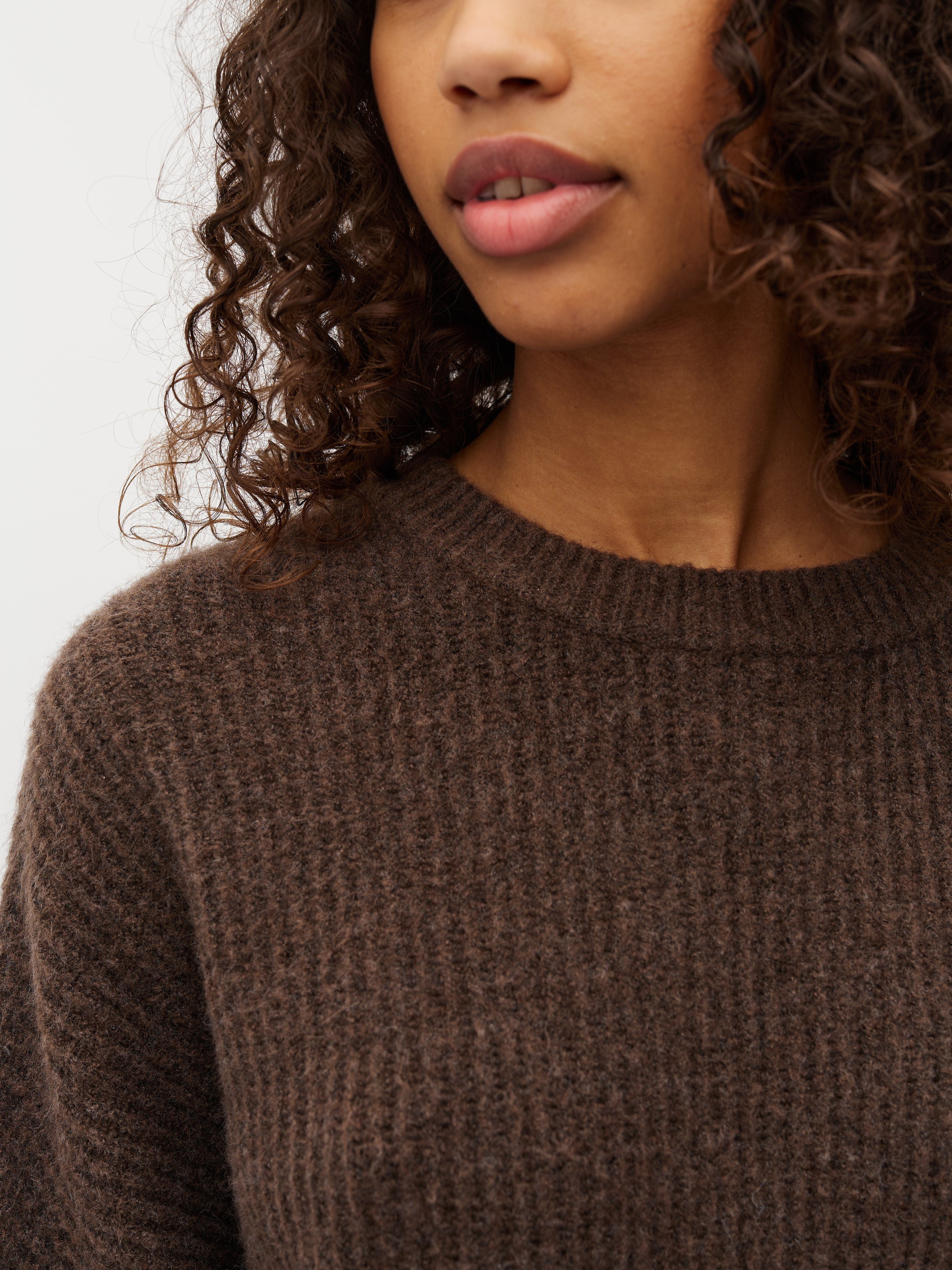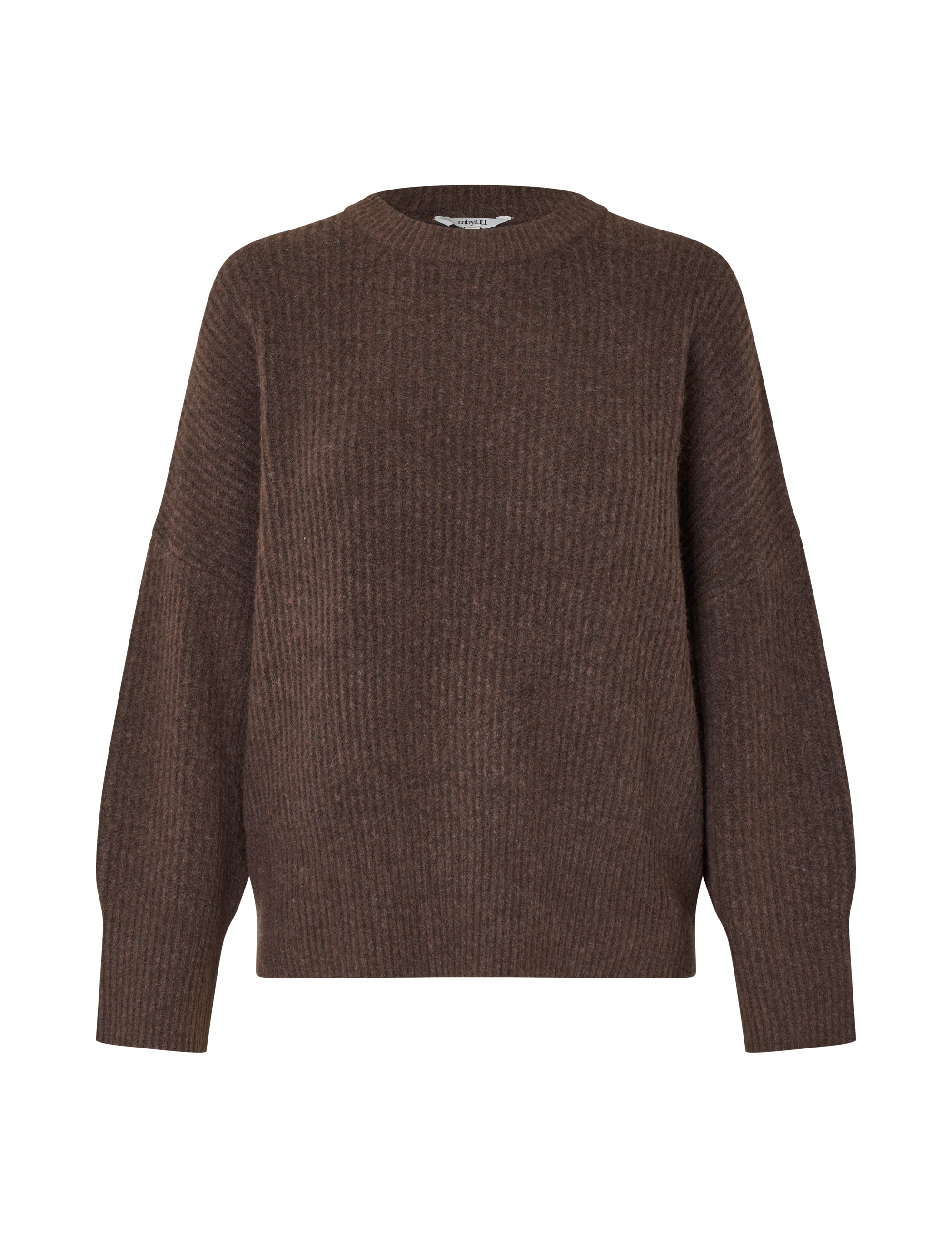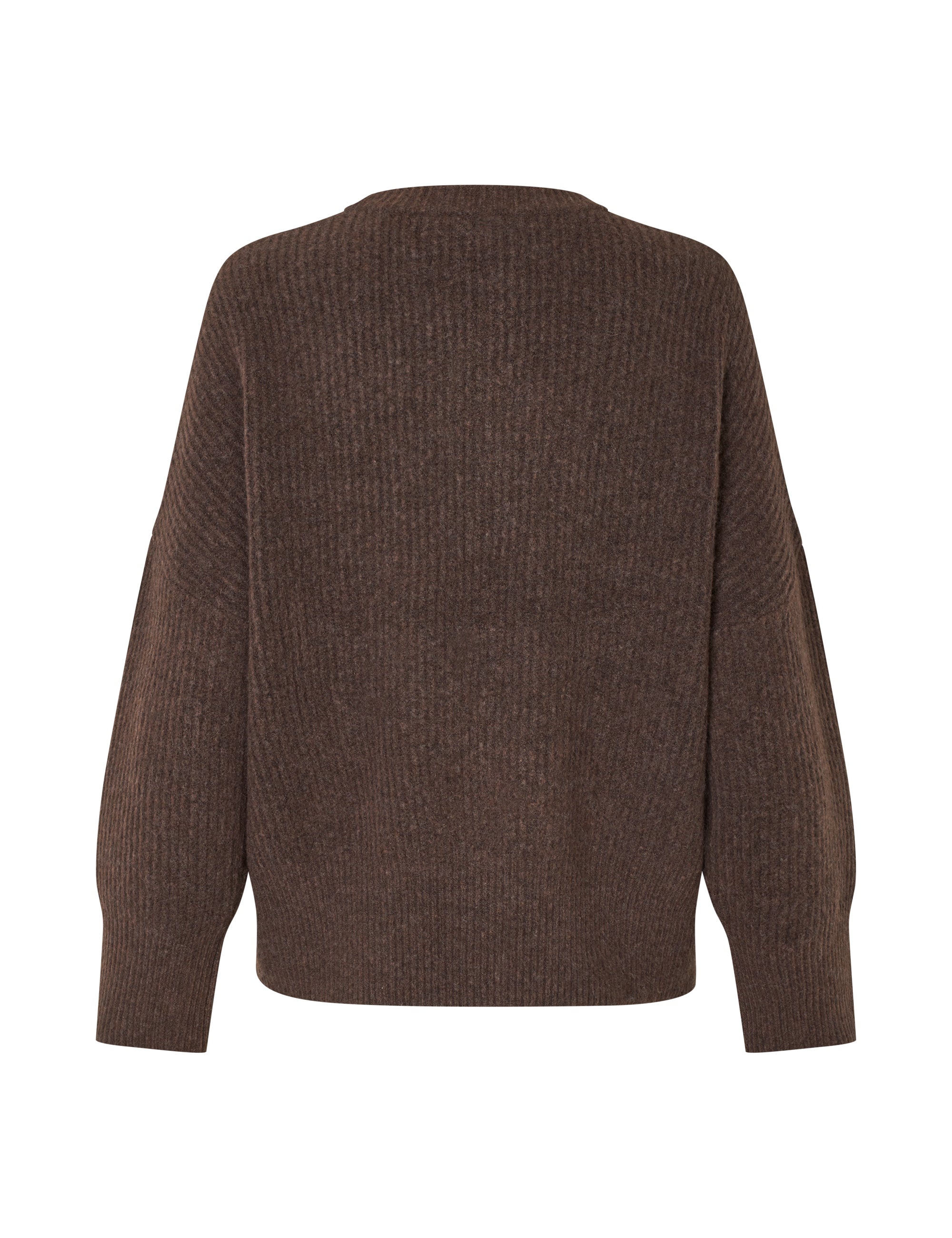 Knitted sweater with o-neck and drop shoulders.