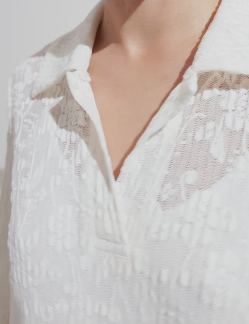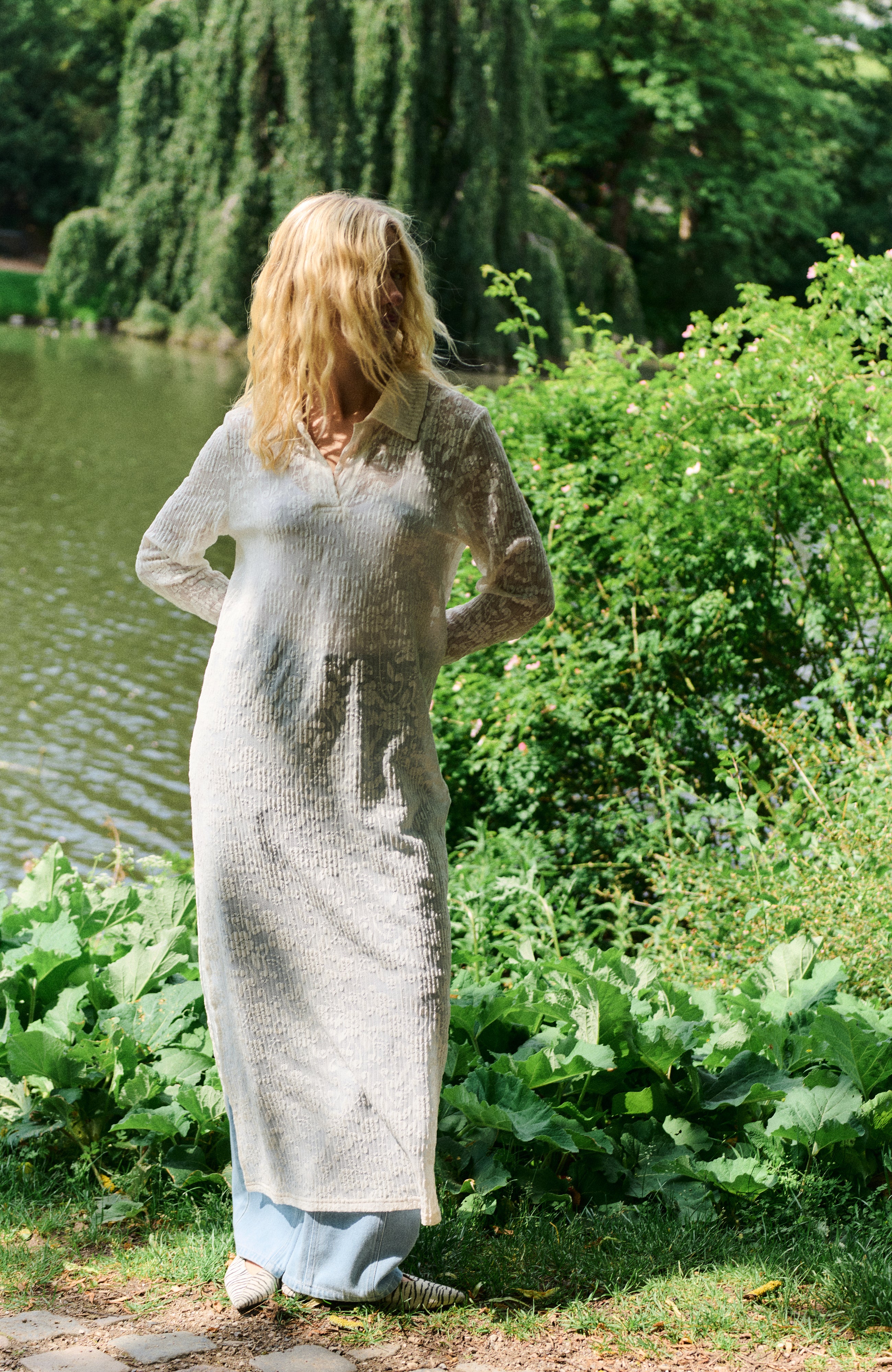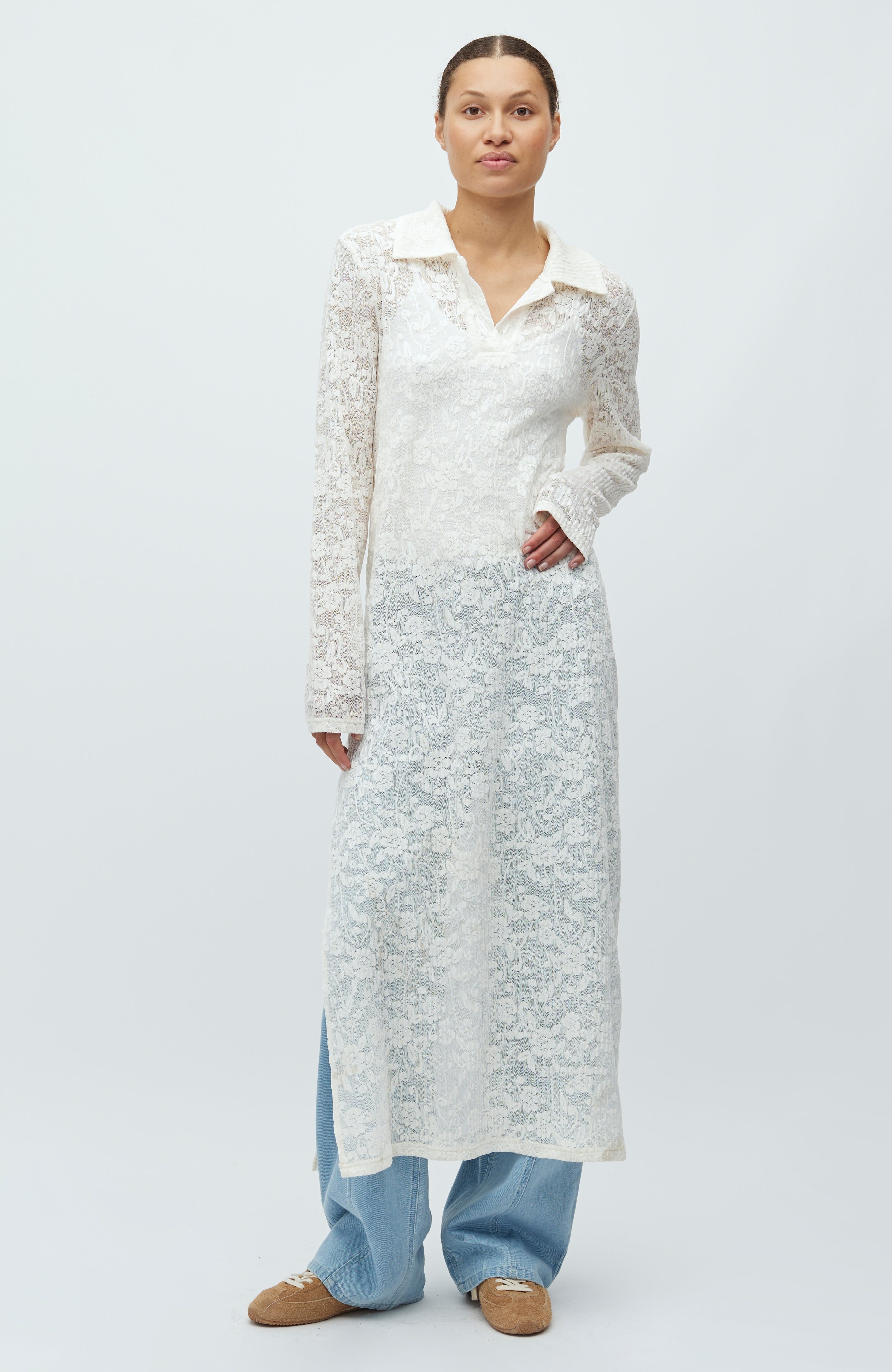 Long-sleeved lace dress.