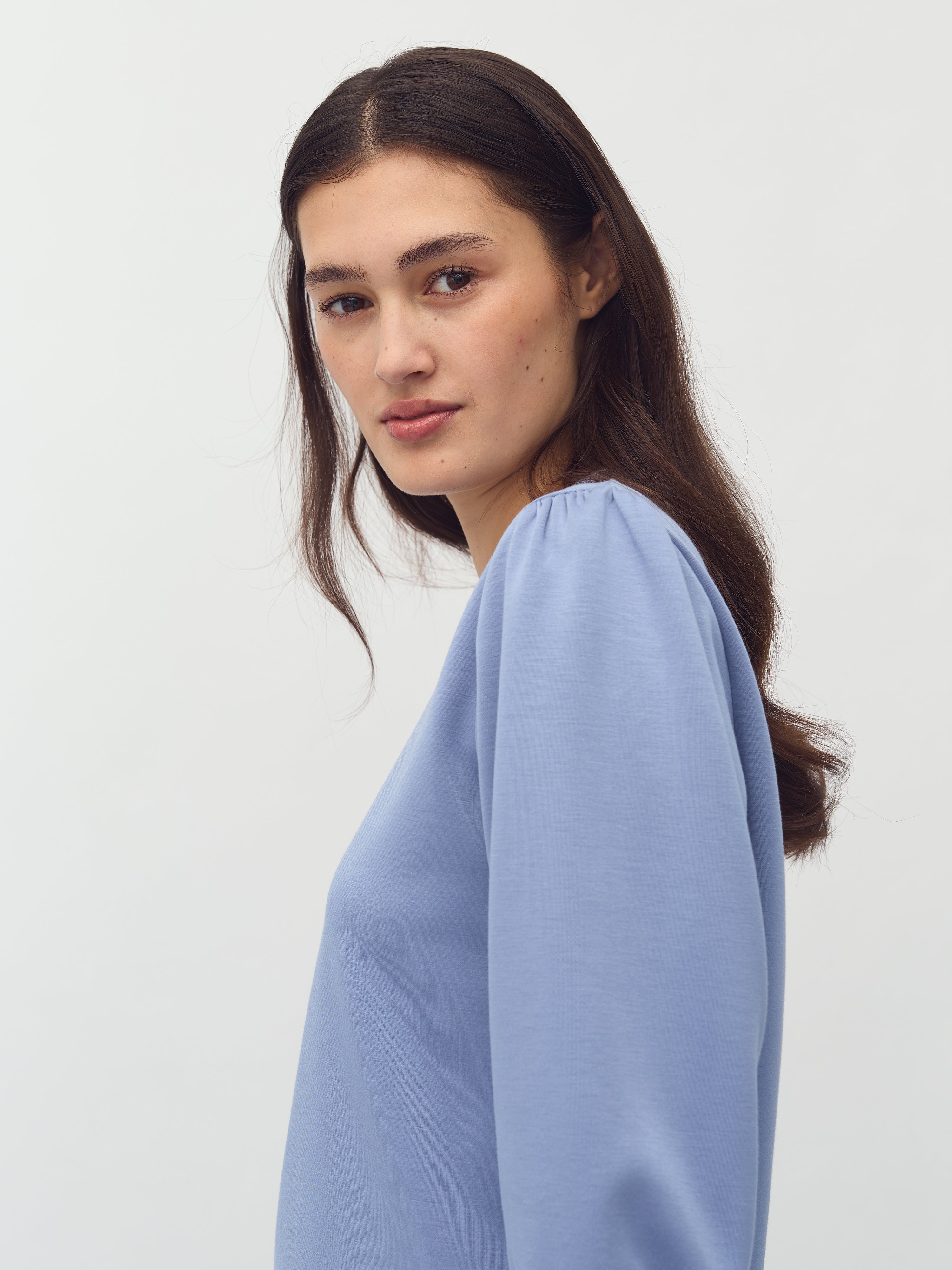 Sweater with short puff sleeves.
