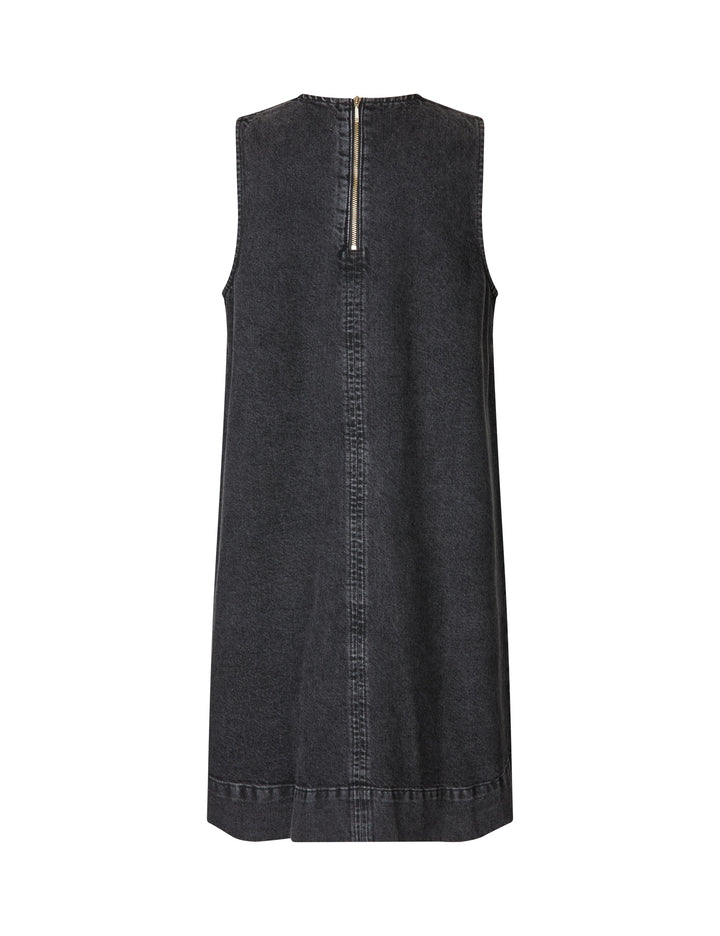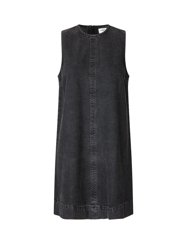 Loose denim dress without sleeves.