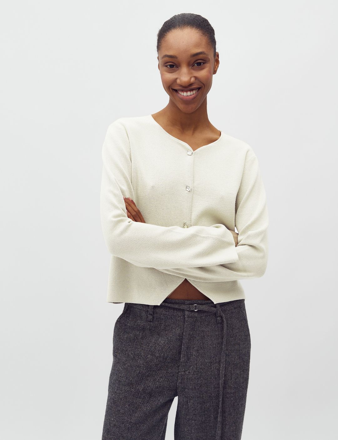 Knitted cardigan with silver buttons.